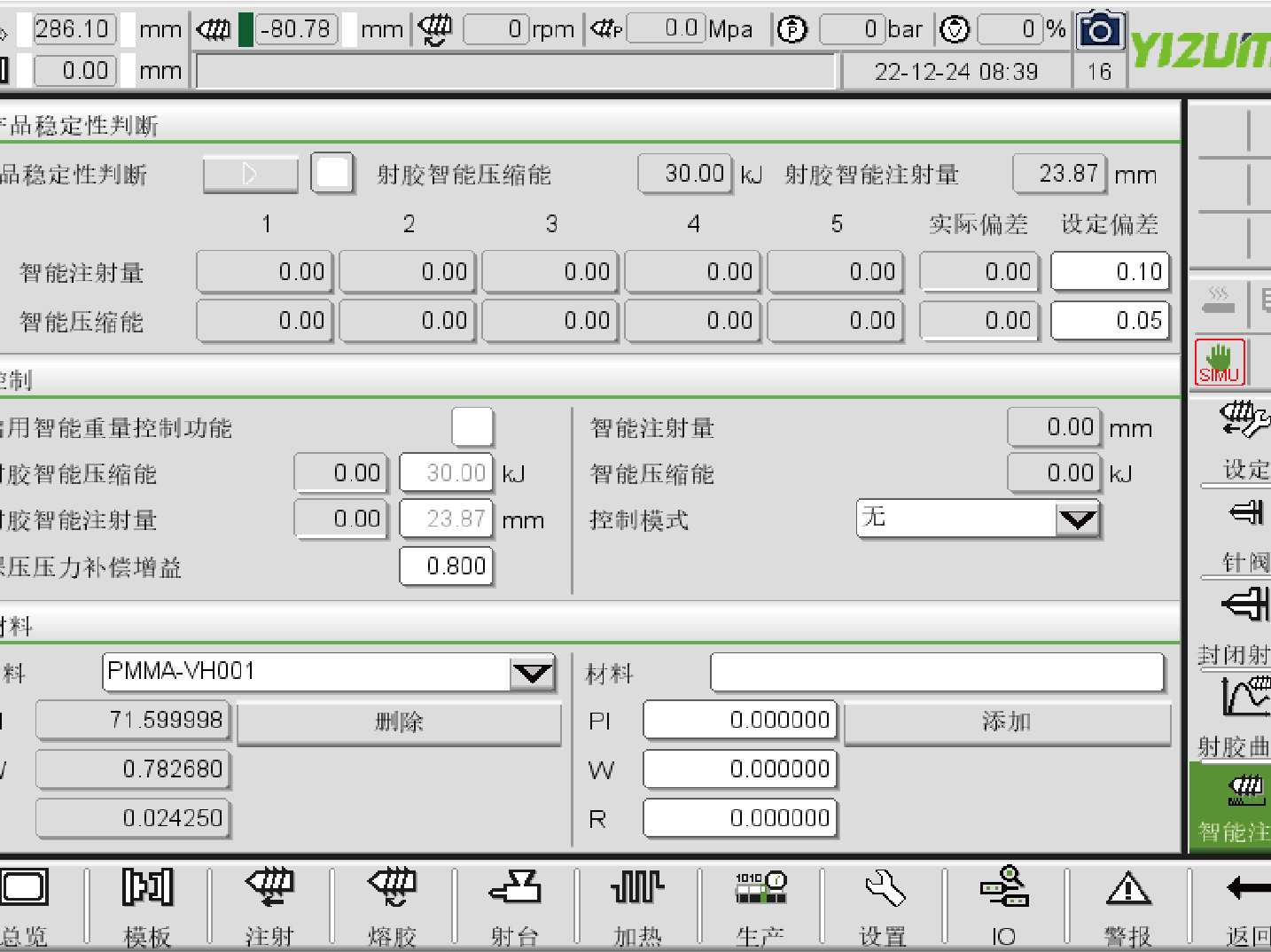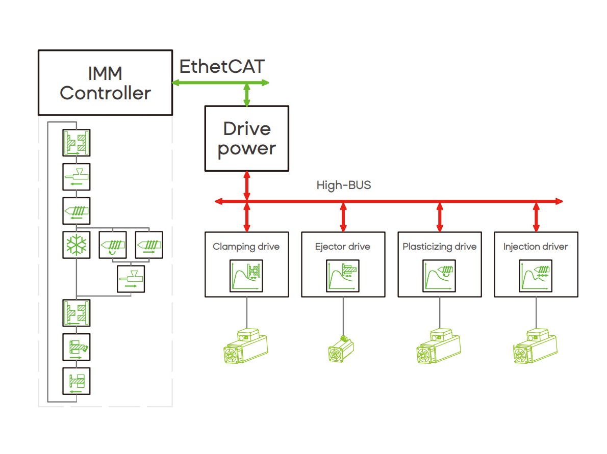 - The process algorithm built into the servo driver isindependently developed by YIZUMI; - Control cycle was reduced from 2-4ms to 0.125ms; - Injection position, mold opening and closing positionswitching position and control position accuracy aremore accurate.