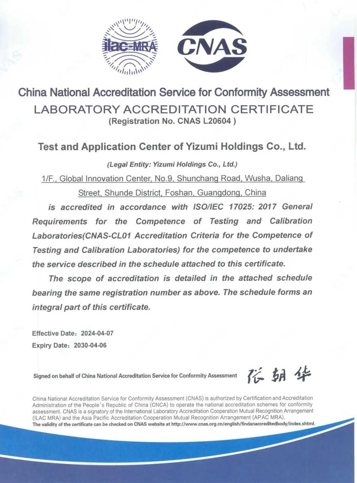 This certificate means that YIZUMI Testing and Application Center can carry out testing services in accordance with relevant international accreditation standards and issue nationally and internationally recognized testing reports with corresponding legal effect. This will be recognized by worldwide mutual recognition bodies in more than 100 countries and regions around the world, and it has international authority and credibility.