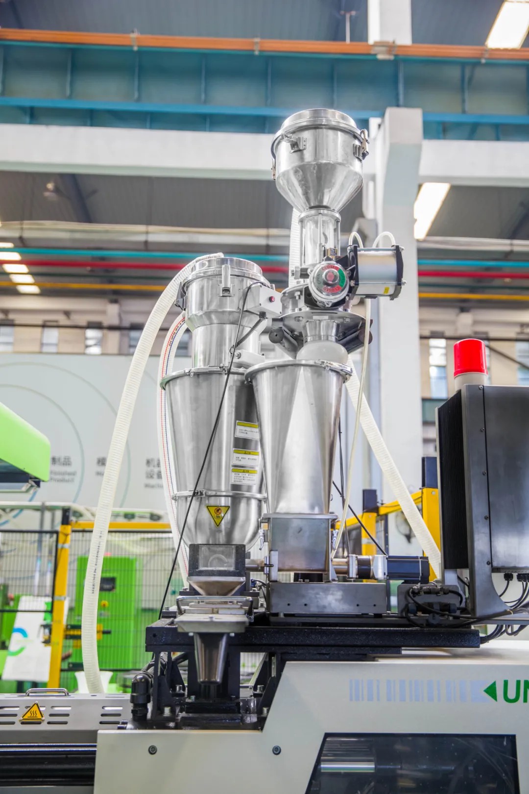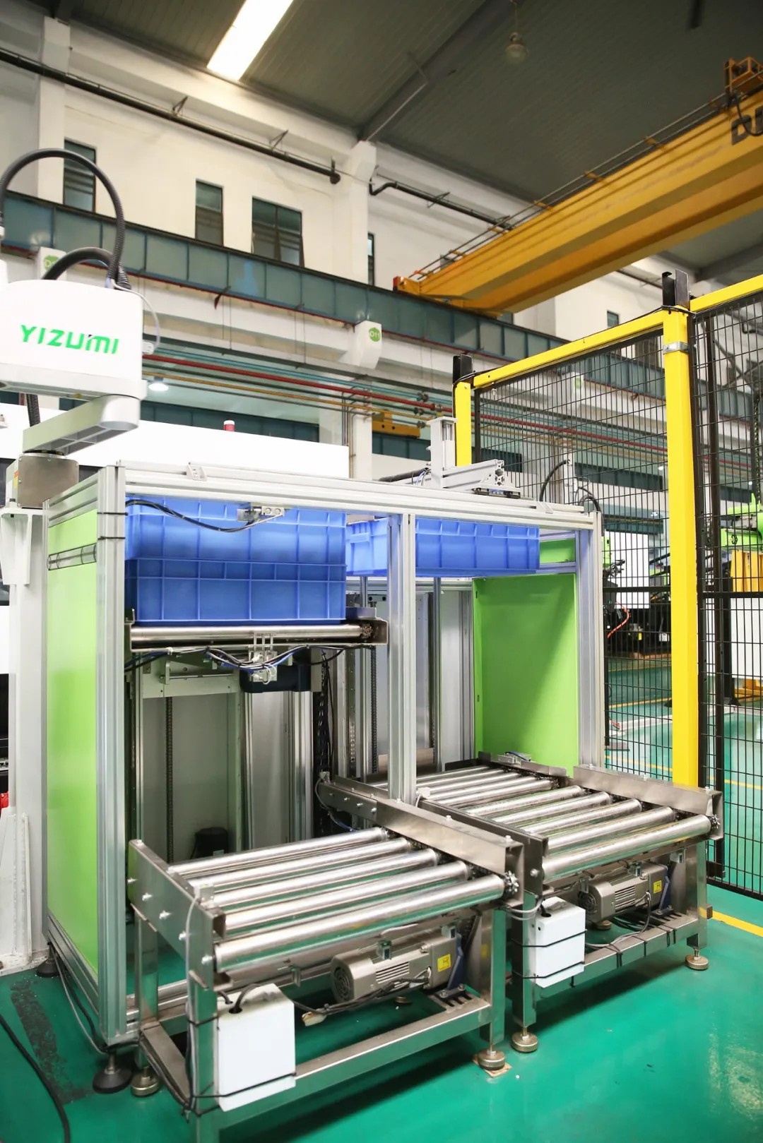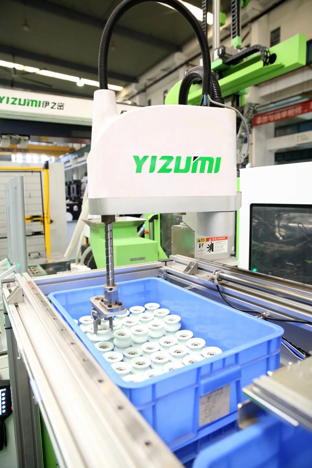 At YIZUMI's production workshop, there is an automated production line for safety door roller. The entire production process is carried out in automated operations, from raw materials feeding to injection molding, automatic conveying and embedding of bearing inserts, in-mold monitoring, automatic product picking up, packing and placing, warehousing, etc. The rollers produced are used for injection molding machine assembly to achieve self-sufficiency, eliminating the need for external procurement.