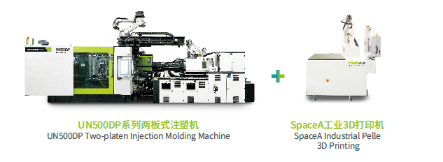UN500DP兩板式注塑機(jī)集成PUR設(shè)備,并搭載InPUR“1+2”創(chuàng)新模具技術(shù)和自動(dòng)化系統(tǒng),實(shí)現(xiàn)“一步成型”ReactPro聚氨酯與注塑一體化成型工藝,高效生產(chǎn)軟觸感表面的汽車發(fā)動(dòng)機(jī)蓋。同時(shí)協(xié)同伊之密SpaceA 柔性增材制造系統(tǒng),實(shí)現(xiàn)規(guī)?;⑺艹尚团c個(gè)性化定制的結(jié)合生產(chǎn)。
