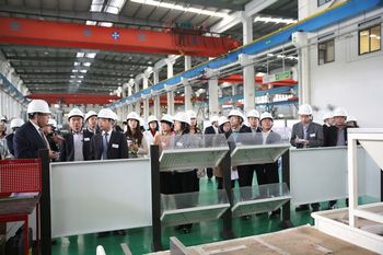 伊之密董事總經(jīng)理甄榮輝(左二)陪同媒體朋友們參觀壓鑄機(jī)車間   伊之密董事總經(jīng)理甄榮輝(左二)陪同媒體朋友們參觀橡膠注射機(jī)車間