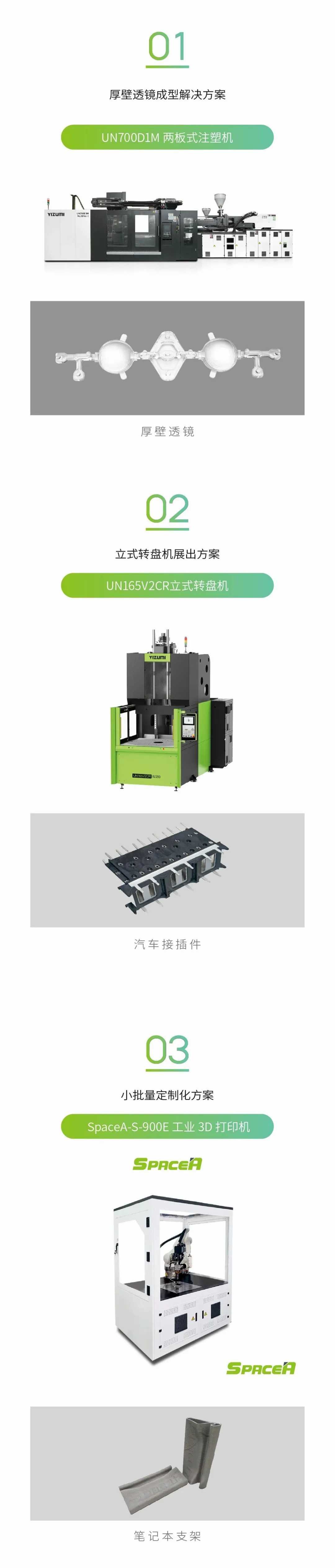 伊之密將展出UN700D1M, UN165V2CR, 2臺(tái)注塑機(jī)及SpaceA-S-900E工業(yè)3D打印機(jī)及其解決方案。