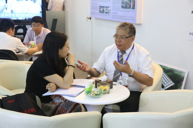 圖釋:伊之密董事總經理甄榮輝(右)在廣州雅式展上接受《現(xiàn)代塑料工業(yè)》采訪